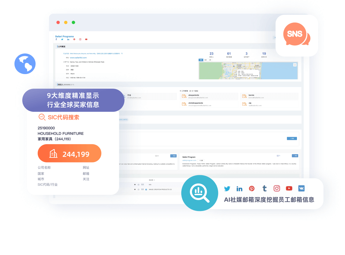 AI社媒邮箱挖掘、采购数据深度分析工具等功能,挖掘目标客户更精准高效