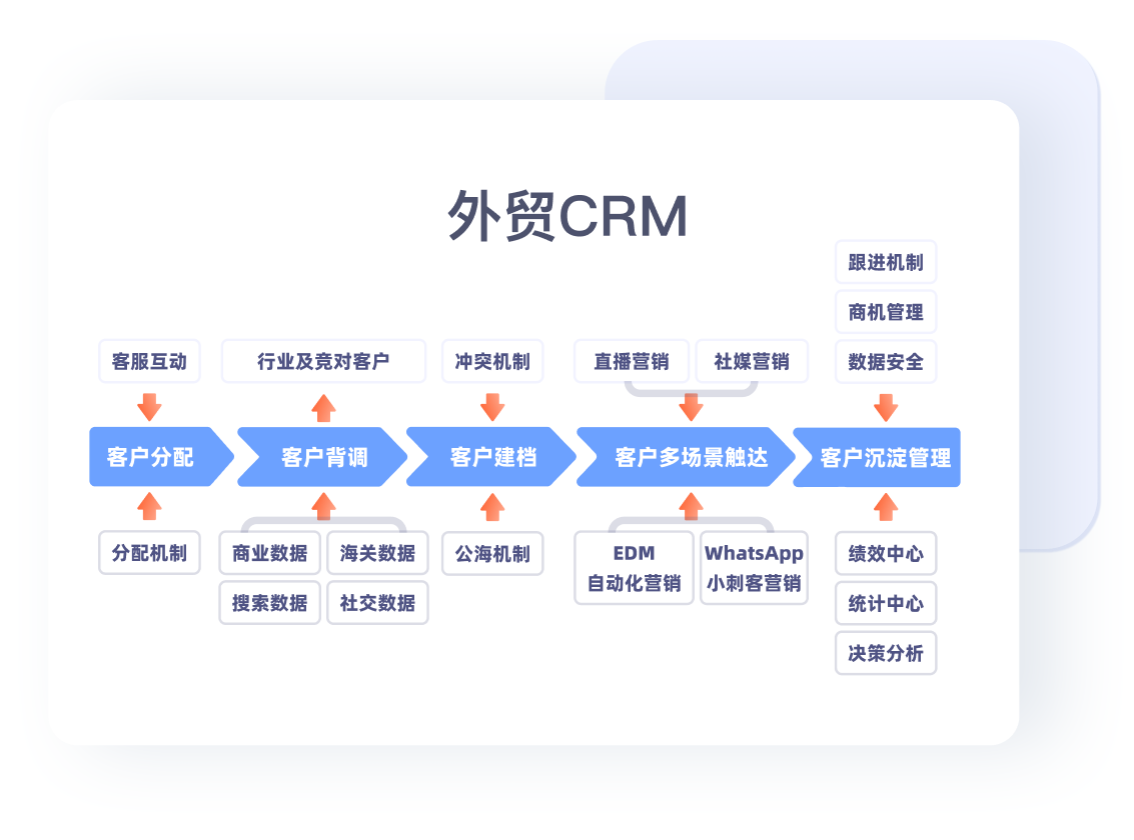 集成外贸ERP和外贸CRM全部功能,以客户为中心,覆盖外贸业务全环节,实现外贸全流程管理。