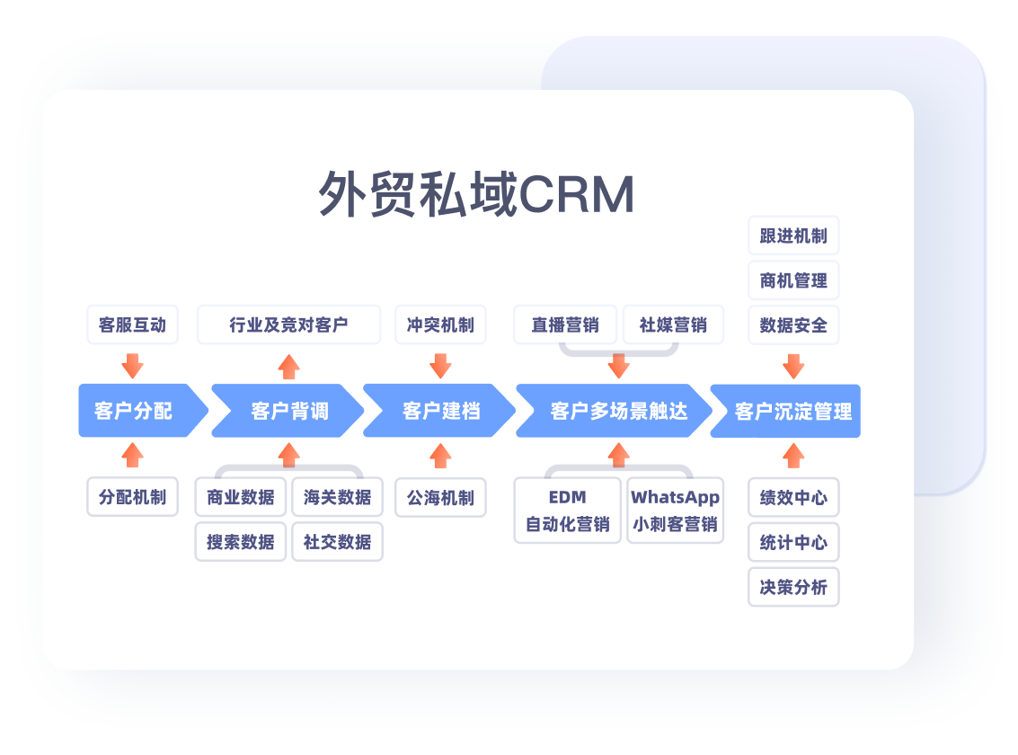 集成外贸私域CRM和外贸ERP全部功能,以客户为中心,覆盖外贸业务全环节,实现外贸全流程管理。