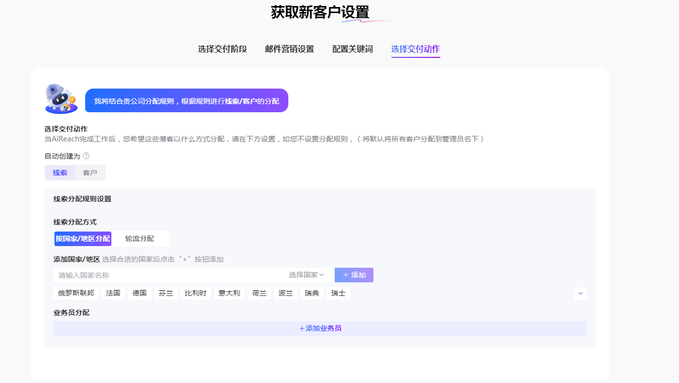 AiReach支持手动分配,也支持系统自动分配。管理员可选择将数据沉淀为“客户”或“线索”,并制定灵活分配策略:既可按“国家/地区”精准分发,让最熟悉当地市场的业务员优先跟进;也可启动“轮流分配”模式,确保资源公平流转,实现高效循环。注意,为了便于后续的盘活与监督,建议选择“自创建为客户”。