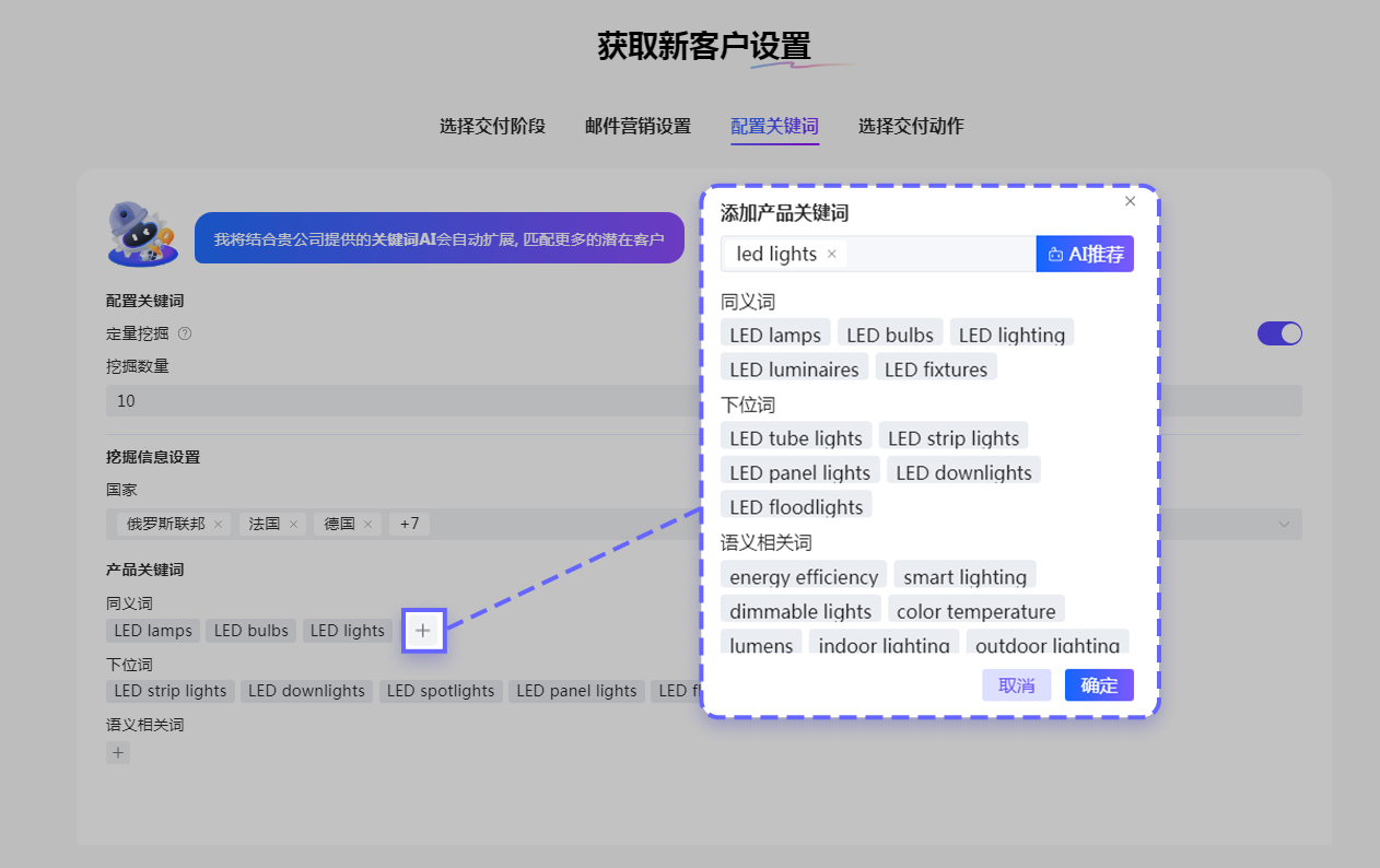 关键词决定了AI获客的质量和数量。AiReach新增两大功能:
