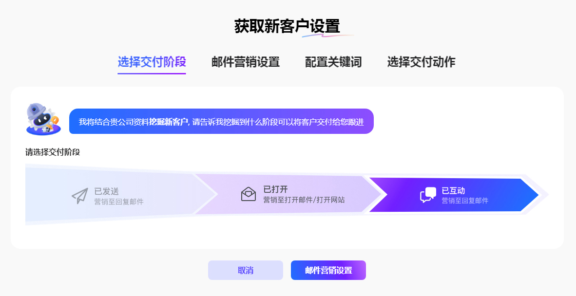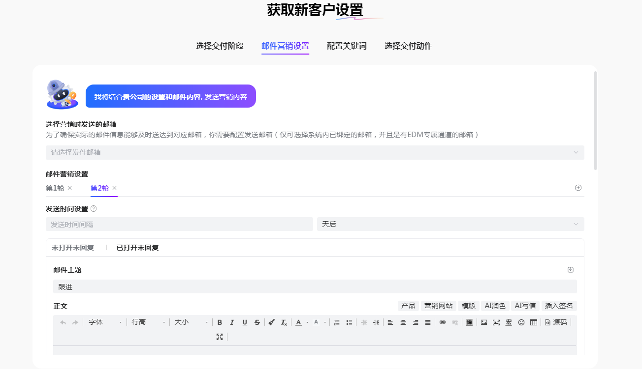 在AiReach设定好顺序、时间、主题、自定义模板,便能自动进行多轮邮件跟进。客户达到设定的交付阶段,自动分配给原先的业务员进行人工跟进。