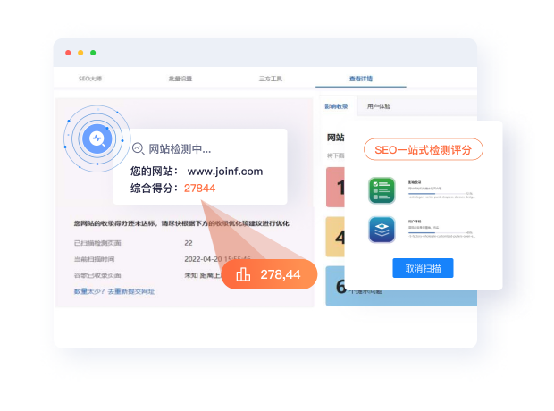 SEO一键检测和评分量化,检测项目多达50多项,覆盖SEO全部关键点