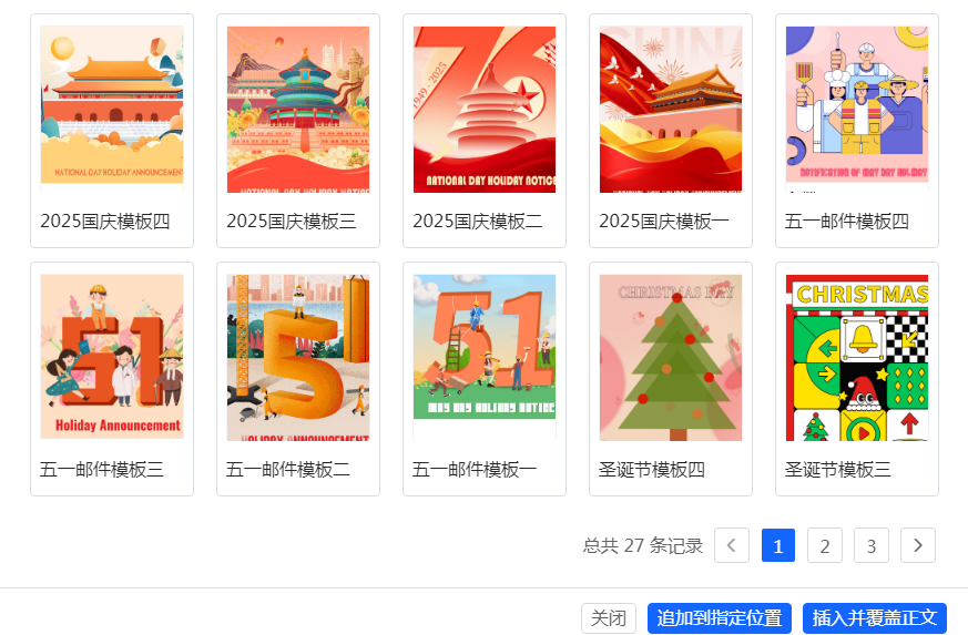 云平台提供国庆邮件模版,依次点击“写邮件→模板→系统→节庆生日”,即可直接套用。