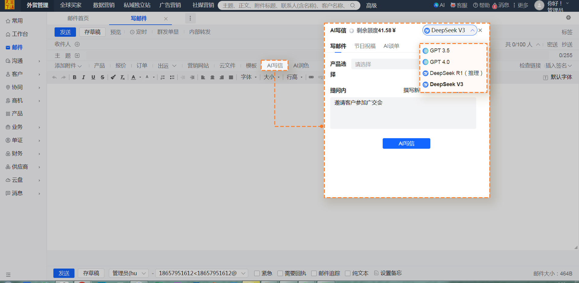 想要个性化邮件?也简单,云平台的AI写信和AI润色功能,引入四大AI模型,30秒即可生成一封专业贴切的邮件。