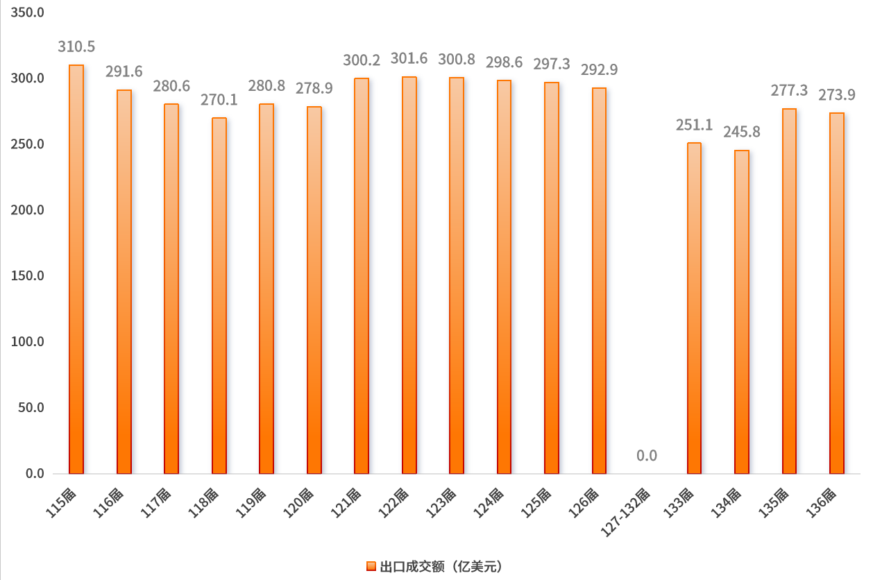 上届(137届)广交会意向出口成交254.4亿美元,同比增长3%。将时间线拉长,比较历年成交金额: