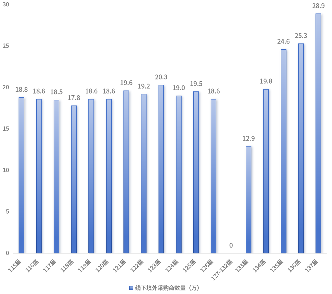 可以看到,除疫情期间未能线下办展外,境外采购商到会人数总体呈波动上升趋势。尤其在展会恢复后,呈现大幅阶梯式上涨,体现出广交会强大的客户黏性与市场吸引力。