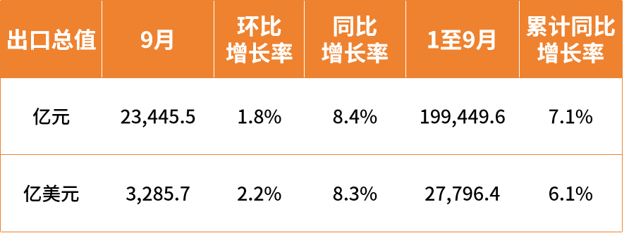 ●按人民币值计算,前三个季度,累计出口19.94万亿元,同比上升7.1%。其中,9月,出口2.34万亿元,环比上升1.8%,同比上升8.4%。