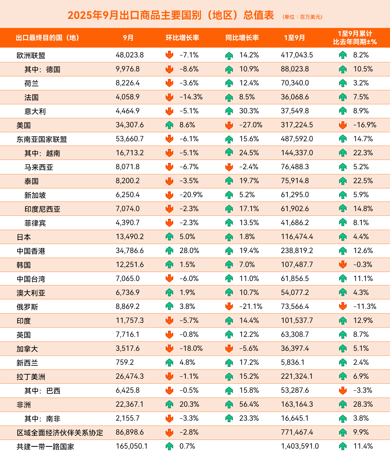 9月海关数据已经出炉,中国对美出口如何?哪些国家(地区)涨幅较大?哪些商品表现较好?一起去看看具体情况吧。