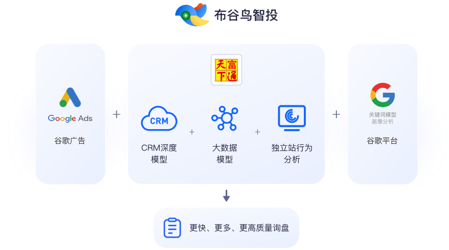 ● “布谷鸟”Google广告智投系统,由谷歌中国和富通天下合作开发,创新结合富通天下CRM业务模型、买家大数据模型、独立站行为分析和Google关键词分析、Google画像分析库等模型,一站式解决广告规划、关键词挖掘、广告创意撰写、关键词出价等Google广告投放难题。让你的广告越投越智能,越投越省钱。