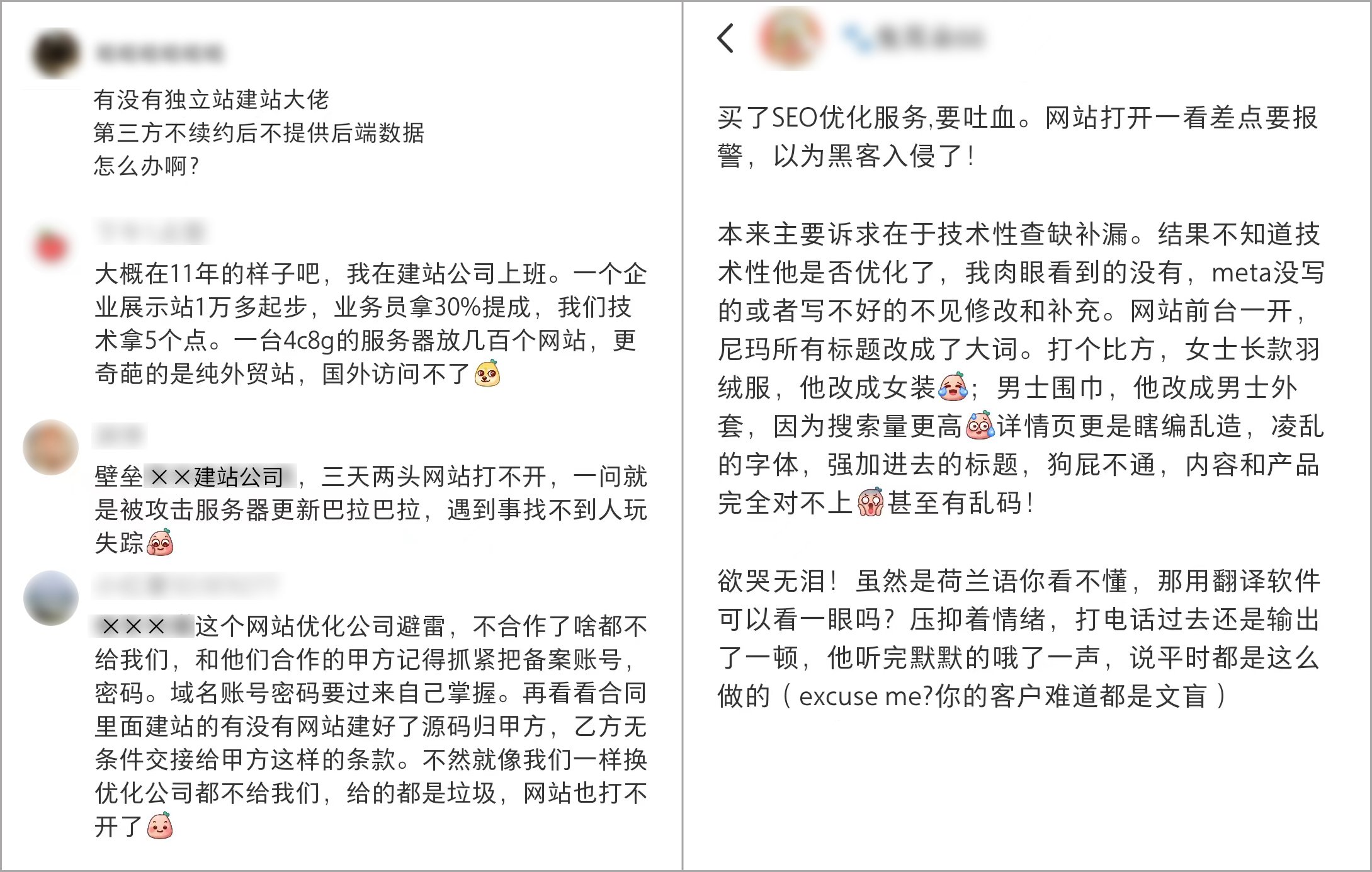 “独立站全权外包,就完完全全陷入被动局面:服务商只有催你烧钱的时候最积极。钱花了,询盘质量也得不到保证。”网上随处可见大家的血泪教训: