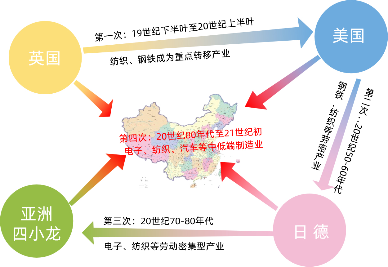 欧美日等发达国家、亚洲“四小龙”等新兴国家→中国。