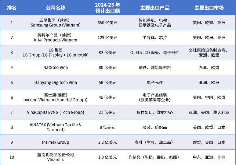 越南出口商前十中,超半数为外资企业,如韩国三星、美国英特尔、韩国LG集团、台湾富士康等。