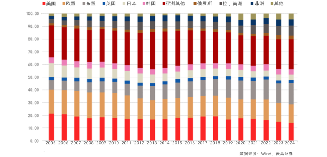 (2005-2024年各地区在中国出口金额中的占比变化图)