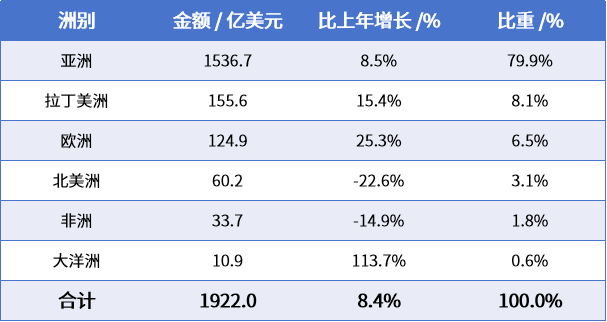 根据《2024年中国对外直接投资公报》显示,中国对外直接投资流量地区构成: