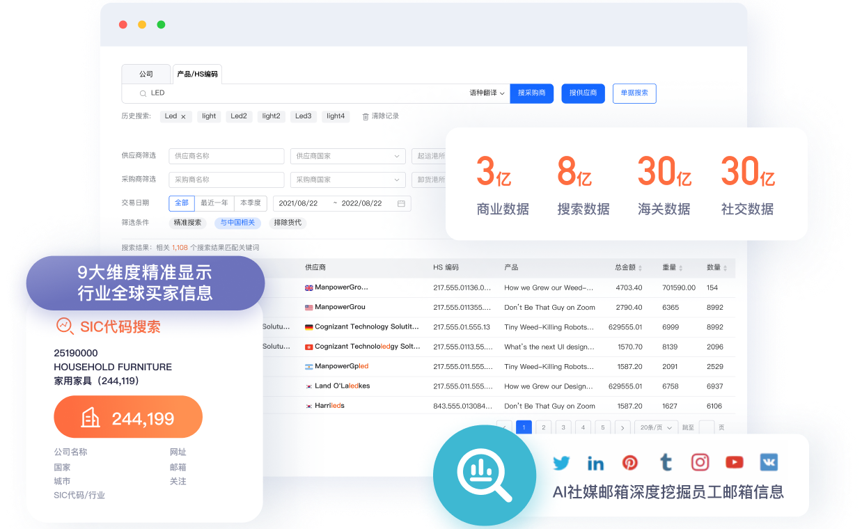 富通天下云平台集成3亿商业数据、8亿搜索数据、30亿海关数据、30亿社交数据。只需要目标公司名称,各平台社媒账号、官网地址、联系人邮箱、采购/供应数据、各项数据分析图等资料一应俱全,基础信息交叉验证客户真实性;采购动态显示客户实力;频繁更换伙伴提示潜在付款风险;产品线变化可预警业务异常或发现切入机会。
