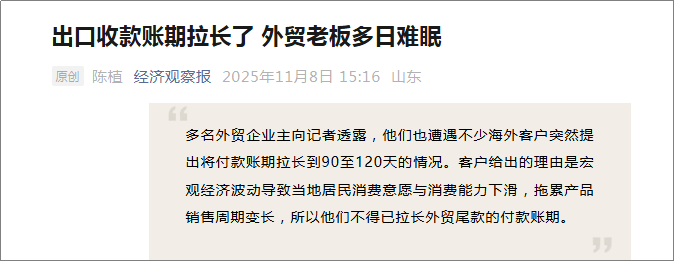 一头是买家欠款风险持续攀升,另一头是账期不断拉长。《经济观察报》近日发了篇文章:要求拉长付款账期的海外客户日益增多,外贸企业资金周转压力不断加大。