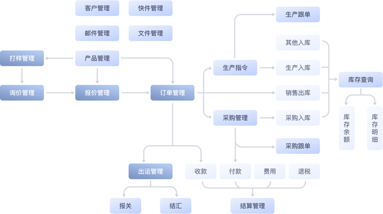 包含报价、订单、采购等功能,满足不同外贸企业的业务管理需求。